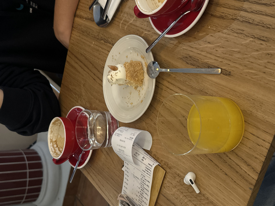 The image depicts an indoor cafe table in Belgrade, Serbia, specifically at Kafeterija, Terazije 25, as evidenced by details on the visible receipt. The wooden table surface is laden with post-consumption items. In the upper left, an almost empty red ceramic coffee cup with a matching saucer and spoon sits next to a clear glass of water. A white paper receipt, partially unrolled and displaying "Kafeterija" and menu items such as "Sok Pomorandza" (orange juice) and "Medenjak" (honey cake), rests on a small tan book. Adjacent to the receipt is a white Apple AirPod earbud. In the lower center, a clear glass contains a quantity of orange juice. To the right, a white plate holds a partially consumed slice of dessert, likely a "Medenjak" as per the receipt, topped with cream, sprinkles, and a single almond, with a long-handled spoon resting beside it. Another red ceramic coffee cup, also appearing partially consumed, and a spoon are visible at the far right edge of the frame. The arm and lower torso of an individual wearing a dark long-sleeved shirt are visible seated at the table in the upper right. A white structural column with red vertical stripes is present in the background.
