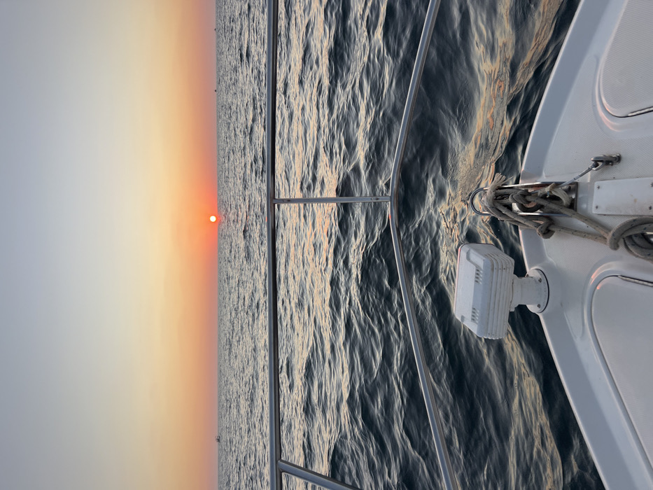 A sunset view from a boat at sea. The sun is a bright orange ball near the horizon where the sky meets the water. The sky transitions from a hazy yellow to a pale blue. The water reflects the colors of the sky, with ripples and waves shimmering in the light. The front of the boat is visible, with metal railings and white fixtures. Ropes are tied to the fixtures.