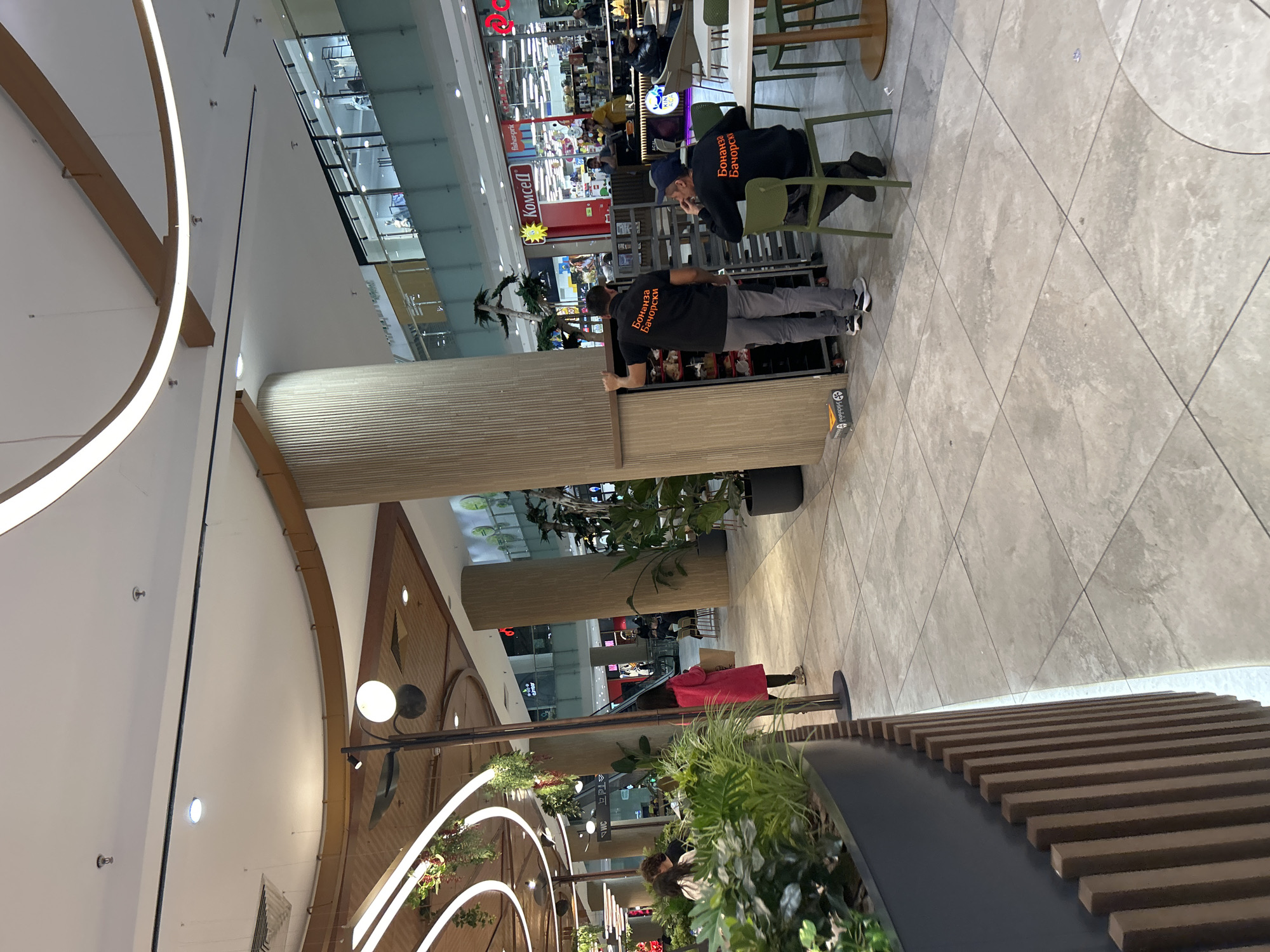 Here is a detailed description of the image: The image depicts an indoor scene in a shopping mall, seemingly in Sofia, Bulgaria, given the presence of signage in the Bulgarian language. The area is well-lit with a mix of natural and artificial lighting. The scene contains several people. Two men are standing near a display case with "Bonanza Bacchorsk" written on their shirts, suggesting a possible association with the product or brand on display. Another person is sitting at a table, wearing a dark shirt. A woman in a pink coat is standing slightly further away. There are more people visible in the background, but they are less distinct due to the distance. Various plants are strategically placed to enhance the aesthetic of the space. The foreground includes greenery in a planter. In the background, there are taller plants next to a column with horizontal ribbing. The shopping mall features multiple levels, as suggested by the visibility of shops and walkways on upper floors. The architecture incorporates curved elements and decorative lighting. The floor is tiled in a light, neutral color with a grid pattern.