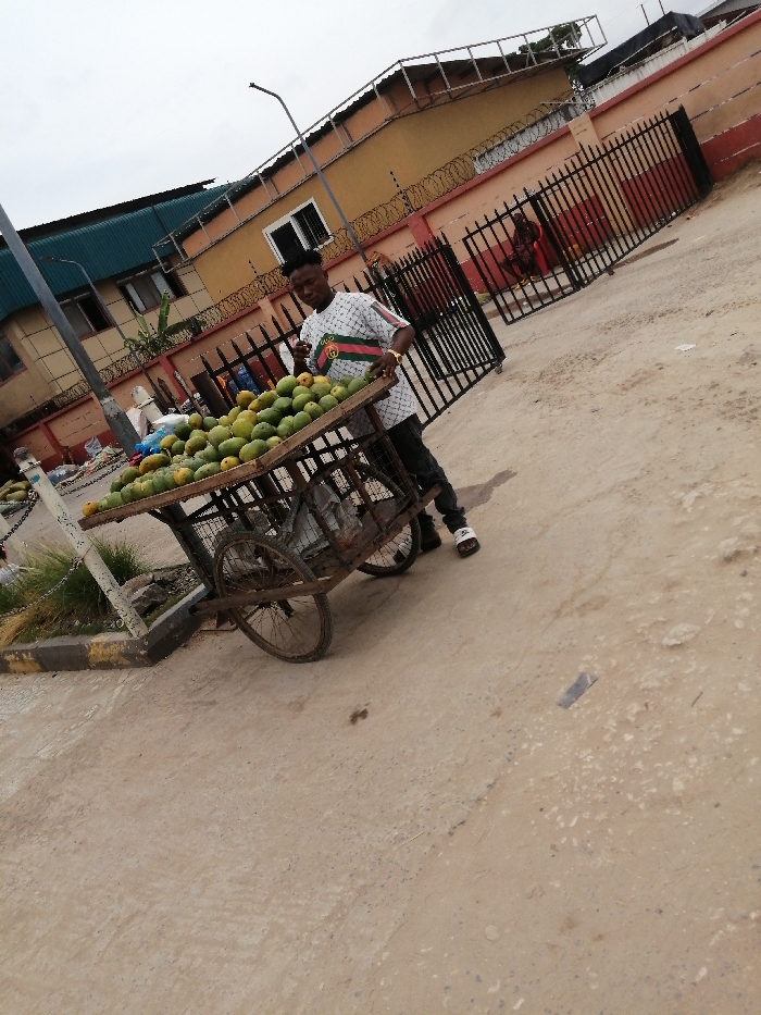 - "A young man stands beside a rickety wooden cart overloaded with green mangoes" by FM-nuac32, licensed under CC BY 4.0