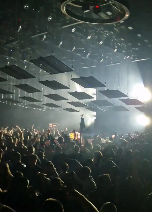 The video depicts a crowded nightclub with a central stage. A large crowd is facing the stage, most of them with their arms raised and filming or taking pictures with their phones. The stage is occupied by a male performer, wearing a hat, and two women in skimpy outfits. Above the crowd, there are multiple square panels hanging from the ceiling. There are also moving stage lights that shine on the crowd and the stage. Large screens show colorful graphics and visuals related to the performance.