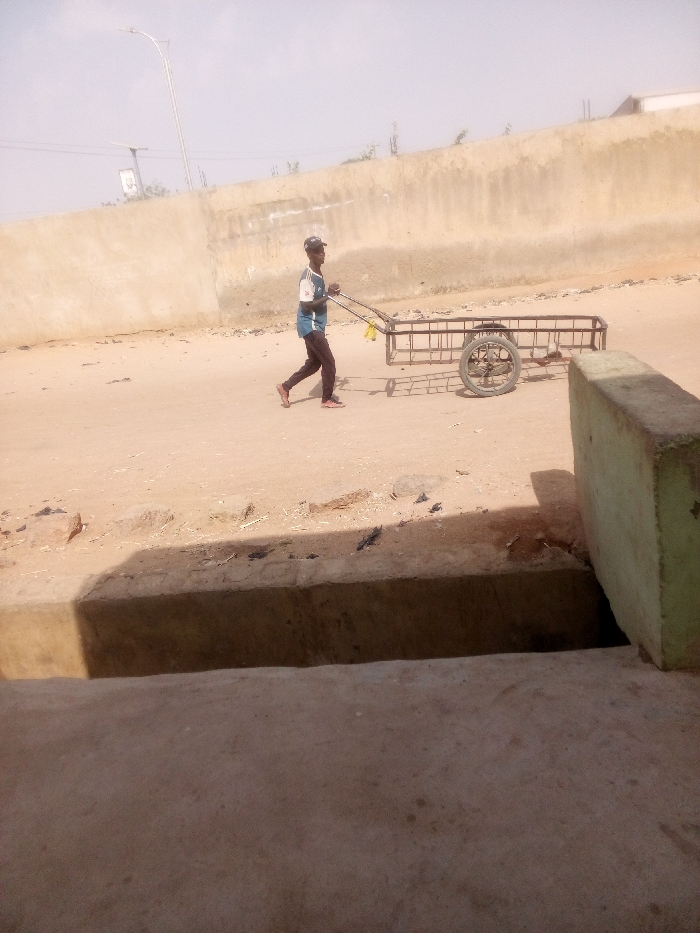 The scene, located in Tudun Murtala, Nigeria, depicts an outdoor environment under daylight. A lone male individual, dressed in a dark baseball cap, a blue and white short-sleeved shirt, dark trousers, and dark sandals, walks from left to right. He is actively pulling a two-wheeled handcart constructed with a rectangular metal cage frame and two bicycle-style wheels; a yellow item is attached to its handle. The ground is unpaved, dusty, and reddish-brown, scattered with small rocks and debris. In the background, a large, light-colored concrete retaining wall or elevated structure spans horizontally. A tall street light pole is visible on the left, rising above the wall. The lower foreground features a concrete drainage channel or gutter running horizontally, partially obscured by shadows, with a light green concrete block visible on the bottom right.