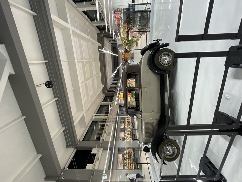 - "A two-tone vintage Ford Model A coupe, featuring a light beige body with dark brown fenders and roof, is displayed as an exhibit behind black metal barriers on a polished, light-colored floor inside a large supermarket in Lyon, France" by FM-ht8wc2, licensed under CC BY 4.0