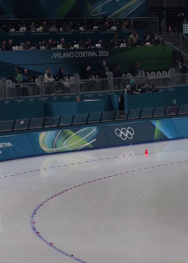 n ice rink with an ice skater wearing an orange and dark blue outfit skating around the curved part of a speed skating track. The skater is facing to the left side of the frame and appears to be practicing. In the background, there are spectators seated in the stands. The rink is decorated with banners that say "MILANO CORTINA 2026" and the Olympic rings logo.