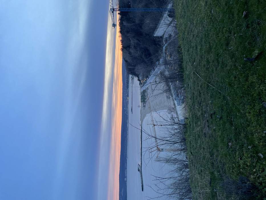The image presents an elevated panoramic view of the Varna Bay in Varna, Bulgaria, during twilight. The sky dominates the upper frame, displaying a gradient of deep blue to purple, transitioning into orange and faint pink hues at the horizon, indicative of either sunrise or sunset. In the immediate foreground, a patch of green grass is visible, interspersed with sparse, leafless deciduous branches and shrubs. Below this, the midground features a prominent sandy beach undergoing construction. Two yellow lattice boom tower cranes are positioned on the left side of the beach area, indicating active development. A concrete breakwater or pier extends into the tranquil, grey-blue water on the left, partially encircling the beach. Adjacent to the beach, a paved road runs parallel to the coastline, occupied by multiple parked vehicles. To the right, a steep, densely wooded hillside, consistent with the terrain of the Sea Garden, descends towards the bay; a tall, blue-grey tower crane is partially visible within this wooded area. The background encompasses the wide expanse of the Varna Bay, stretching towards a distant shoreline where scattered artificial lights delineate an urban area with visible buildings and port infrastructure. No individuals are discernibly present within the frame. The overall scene captures a coastal landscape in a state of development, observed from an elevated vantage point, likely from the Panoramic Stairs or upper Sea Garden area overlooking the Central/South beaches.