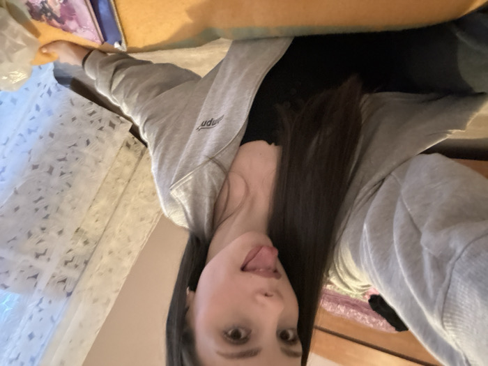 The scene is an indoor setting in a private residence located in the city of Волховец, Russia. A young adult female with long, dark hair and fair skin is depicted in a low-angle selfie. She is wearing a light grey zippered hoodie over a black top and has small earrings. Her expression is characterized by an extended tongue. Her left arm is raised, holding the camera, while her right hand rests on an orange surface. In the immediate foreground, on this orange surface, lies an open magazine or book featuring anime-style imagery, next to a crinkled white plastic bag. The background on the left shows a wooden furniture item, possibly a bed frame or headboard, with folded pink and black fabric. To the right, a window is visible, covered by a white sheer curtain with a textured pattern, through which natural light enters the room.