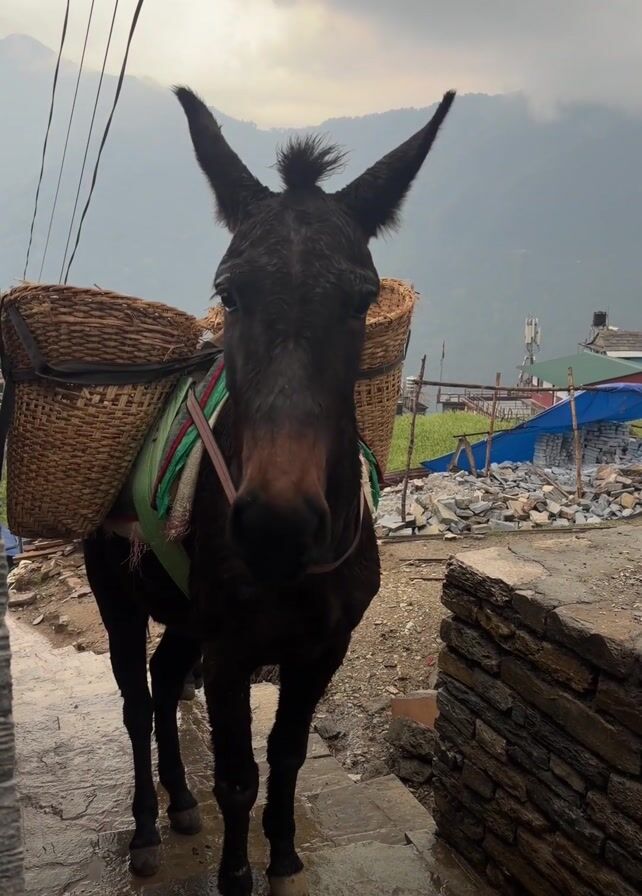 - "A donkey stands on a wet stone path with large wicker baskets attached to its back" by FM-7eA3G2, licensed under CC BY 4.0
