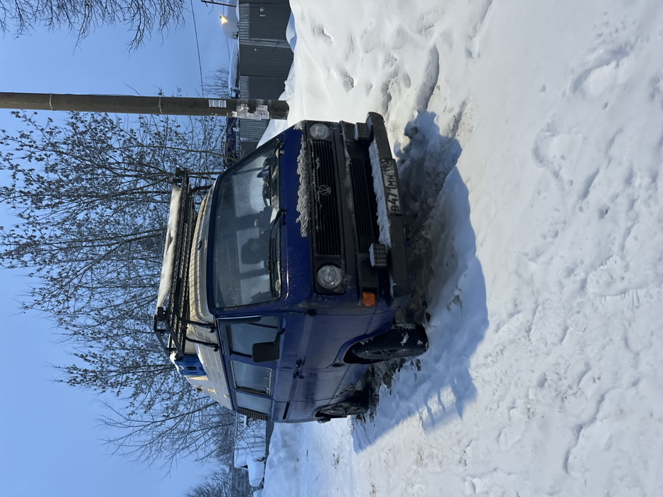 A blue Volkswagen van, equipped with a roof rack, is parked in deep snow. The vehicle's front is angled slightly towards the viewer. The license plate is partially visible, indicating a Russian registration. Snow is piled high around the van's tires. Behind the van, there are snow-covered ground, leafless trees, a utility pole, and a glimpse of a building. The sky is blue, suggesting a clear, winter day.