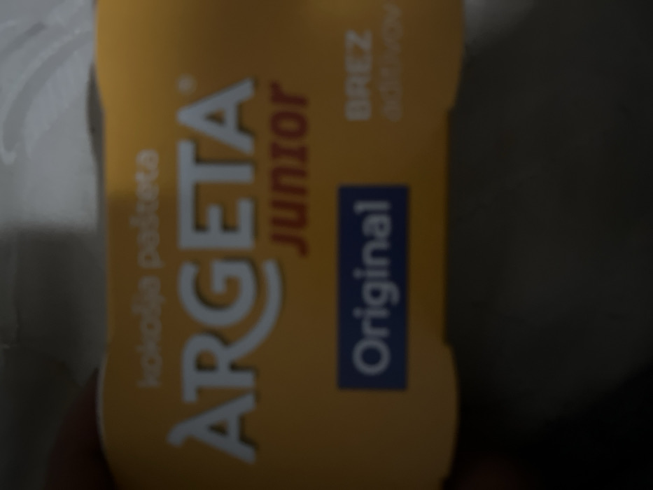 The image displays a close-up, slightly out-of-focus view of a packaged food product. The primary subject is a yellow-orange rectangular container, held by a human hand, partially visible on the left. The container's label features prominent white lettering for the brand "ARGETA," with the word "JUNIOR" in red positioned directly below it. Above the "ARGETA" logo, the text "Kokošja pašteta" (Chicken pâté) is visible in a lighter yellow hue. A blue rectangular label on the lower-left portion of the package identifies the product variant as "Original." To the right of the "Original" label, the words "BREZ aditivov" (without additives) are partially visible. No other individuals or actions are discernible. The background is dark and highly blurred, providing no contextual details about the surrounding environment or its specific location. The image itself provides no visual information to determine its specific location within the city of Brežice, Slovenia.