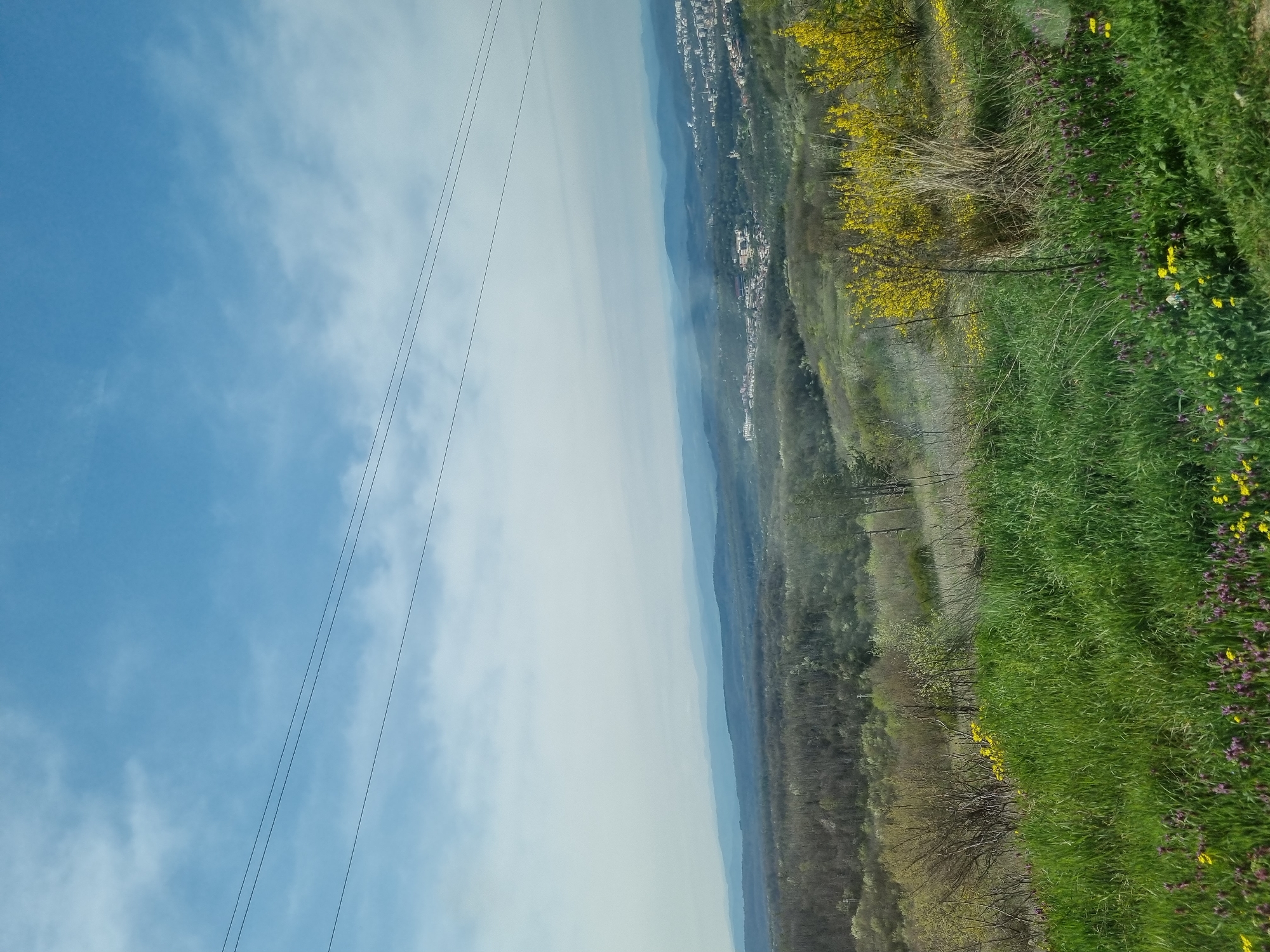 n elevated view of Arbanassi, Bulgaria. The sky, with blue and white clouds, occupies a significant portion of the frame on the left, with utility lines visible against it. In the center, hazy mountains stretch into the distance, with glimpses of buildings indicating settlements. The right side of the image features a field of green grass interspersed with yellow and purple wildflowers. Bushes and trees line the edge of the field, bordering a less cultivated area of forest and vegetation.