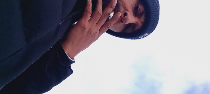 The image displays a low-angle, close-up portrait of an adult male. He is depicted from the upper chest upwards, gazing directly into the camera. The man has a dark skin tone and facial hair, including a mustache. He is wearing a dark knit beanie, which features a light-colored emblem on its left side. His attire includes a dark, possibly padded, jacket. A white cuff of an underlying long-sleeved garment is visible at his right wrist. The individual's right hand is raised to his mouth, holding a lit cigarette with a glowing ember. The background consists solely of an overcast sky, showing a mix of white and pale blue cloud formations, indicating an outdoor daytime setting. The specific location within the city of Sidi Allal El Bahraoui, Morocco, cannot be determined from the visual information presented in the image.