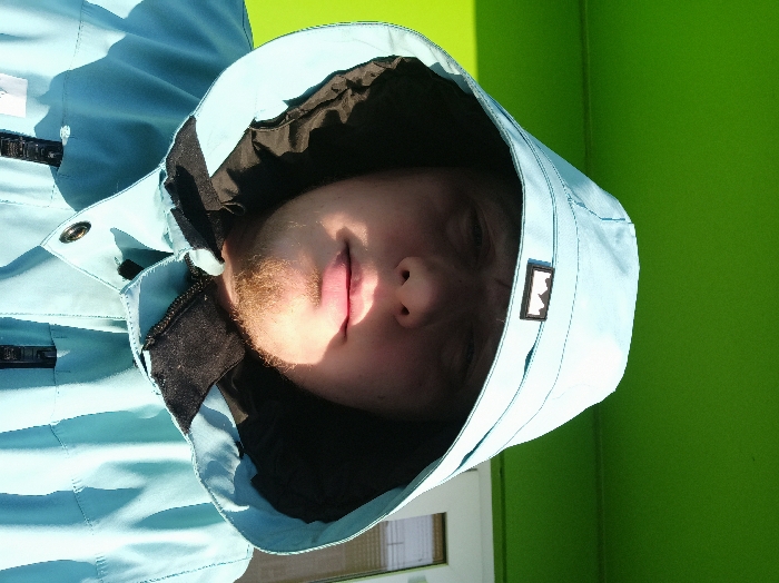 A male individual is depicted in a close-up portrait, facing the camera, outdoors in Кондратово, Russia. He wears a light blue hooded jacket with a black inner lining; the hood is raised, partially shadowing his upper face. A black rectangular patch bearing a white stylized mountain or crown logo is visible on the hood. The individual has light stubble on his chin and jawline. The background features a prominent bright lime-green wall or surface on the left and upper sections. To the right, a white building element and a window with horizontal blinds are discernible. Sunlight illuminates the subject primarily from the right, casting subtle shadows on the left side of his face and jacket.