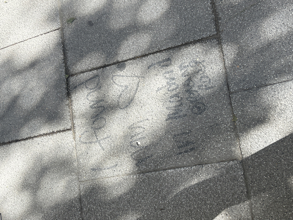 A close-up, downward-angled image depicts a light grey, speckled concrete sidewalk in Madrid, Spain, composed of rectangular tiles with visible seams. Dappled shadows, consistent with overhead foliage, are cast across the sunlit surface. Dark, chalk-like graffiti is present on two adjacent tiles. The inscription reads: "I Found" on the top line, with "my" positioned below "I", and a heart symbol drawn below "Found". Below this, the text "In Madrid" is written, followed by a smaller, less distinct inscription that appears to be an "@emily" handle and a four-digit year, possibly "2018" or "2019". No individuals or other distinct objects are visible in the scene.
