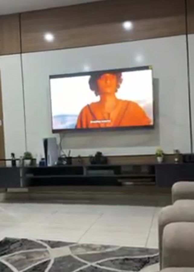 A person is watching a television in a living room. The television is mounted on a white wall with a brown wood accent. A black TV stand sits below the television, and a PlayStation 5 console is placed on the left side of the stand. The television is playing a video of a person with curly hair, an orange top, and a light brown complexion. The video has subtitles that read, "Breathes heavily" and "[sighs]". A grey couch and a black-and-grey rug are visible in the foreground. The room is well-lit with recessed lighting in the ceiling.
