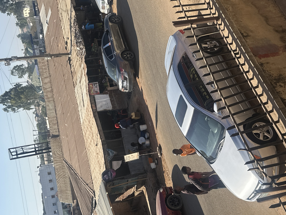 This image presents an elevated view of a bustling street scene in Jos, Nigeria, under clear daylight, casting sharp shadows. In the foreground, a silver Honda Accord Crosstour or similar crossover vehicle is parked, partially obscured by a low concrete wall topped with a black metal fence. Three males are positioned near the front driver's side of the silver vehicle; one in an orange t-shirt stands facing two others, who wear dark shirts. The asphalt road traverses the midground. A dark grey Honda sedan is parked on the road, facing left. To its left, the rear of a maroon car is visible, parked off the road. Across the street, a row of single-story commercial structures with corrugated metal roofs lines the pavement. A blue "Goldberg" beer sign is affixed to the leftmost stall. A white standing sign, partially readable, displays "FOOD IS READY." A person with a red head covering walks away from these stalls, carrying a yellow plastic crate. Another individual is bent over near several white containers on the ground. Further right, within another stall, a person wearing a light hat is visible amidst various goods. A white sedan is partially visible on the far right of the street. The background includes additional buildings with similar corrugated roofs, numerous green trees, and a modern multi-story building on the left. A tall black metal lattice structure stands against the sky. A utility pole with multiple cross-arms and power lines is prominent on the right. A sign, partially legible as "ACE OIL CO LTD," is visible near what appears to be a petrol station in the far-right background.