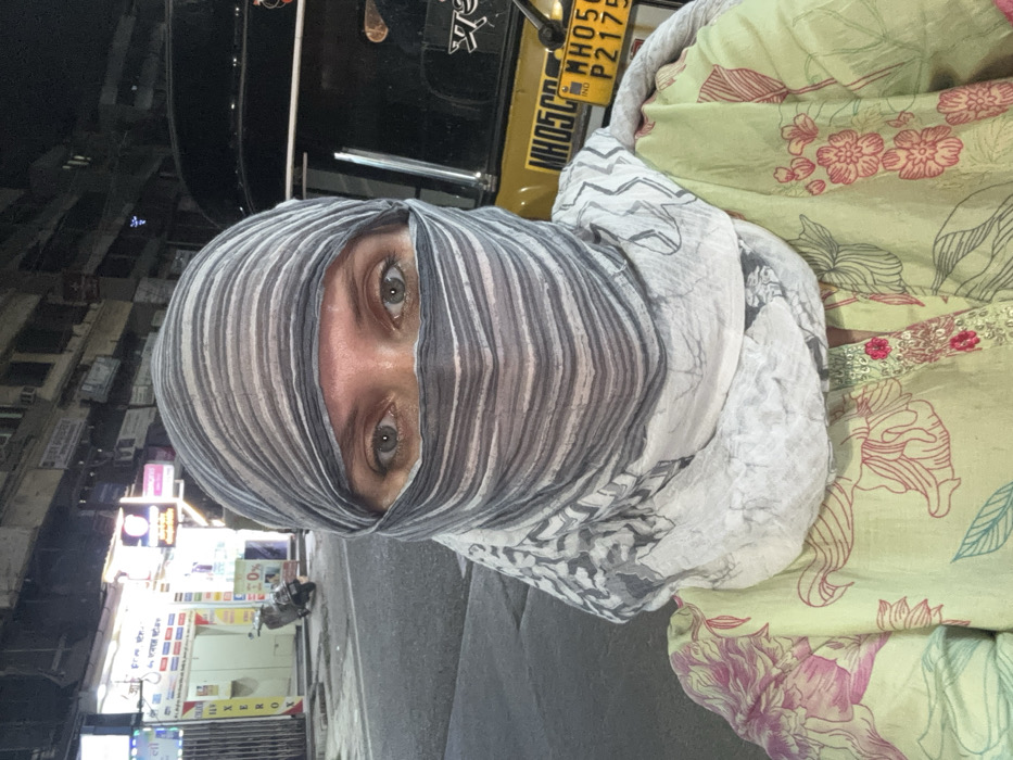 The image displays a close-up, eye-level perspective of an individual with their face largely covered by a grey and white striped and patterned scarf, leaving only the eyes and forehead exposed. The individual has light-colored eyes and is wearing a light green garment adorned with pink floral patterns and red sequin embroidery near the collar. The scene is an urban street at night or dusk, illuminated by artificial lights. In the background on the left, several storefronts are visible with illuminated signs, including one clearly marked "XEROX" and others displaying Hindi/Marathi script. A white scooter is parked on the pavement in front of these shops. To the right, the front portion of a yellow auto-rickshaw is present, displaying a license plate reading "MH05C... P2175". The "MH05" registration identifies the vehicle as belonging to the Kalyan Regional Transport Office jurisdiction in Maharashtra, India, situating the location within the city of Ambernath, India, or its immediate vicinity. No explicit actions or interactions are depicted beyond the subject's direct gaze.