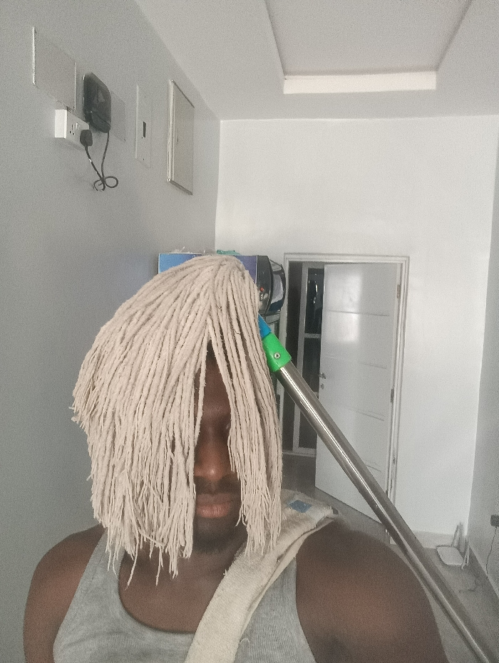 An individual with dark skin, wearing a grey tank top and a light-colored towel draped over their right shoulder, is depicted indoors in Gwarinpa, Nigeria. The individual has positioned a light beige string mop head over their face, obscuring the upper half and most facial features. The metallic handle of the mop extends diagonally downwards towards the right. The background features light-colored walls. On the left wall, a white electrical socket with a black plug and coiled cable is visible, accompanied by multiple white rectangular wall panels. On the right, a white door is partially ajar, revealing a darker interior space. A rectangular light fixture or recess is present on the ceiling. A small white object, possibly a stool, is visible against the wall in the lower right background.