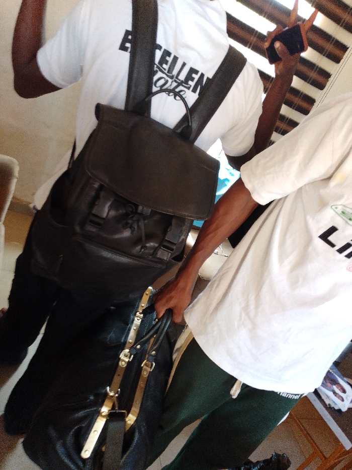 Two individuals are visible indoors in an unknown location. The subject on the left, partially obscured, wears a white t-shirt with "EXCELLENT" and a smaller cursive word (possibly "Taste" or "Style") printed in black, along with black trousers. A dark brown or black leather backpack with a flap, drawstring, and buckle details is worn on their back. The subject on the right, also partially visible, wears a white t-shirt with a multicolor graphic and dark green sweatpants featuring a white drawstring and stripe. This individual holds a black leather duffel bag with prominent brass-colored hardware and carrying handles in their right hand. Their left hand holds a dark-colored smartphone, with the index and middle fingers extended in a "V" gesture. The background includes a light-colored wall on the left and horizontal blinds or panels on the right. The floor appears to be a light-colored surface.