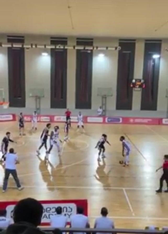 basketball game in progress, filmed from the stands