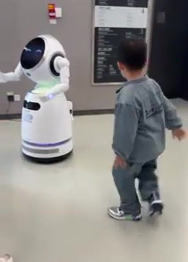two children interacting with a white, dome-shaped robot in what appears to be a public area, possibly a shopping center or mall. The robot has a screen for a face and arms with lights. Initially, a boy in a gray outfit dances enthusiastically near the robot, even falling to the floor at one point. Then, he moves to stand with a girl dressed in light colors as they both face the robot. The robot makes arm gestures, seemingly in response to the children's actions. Behind the robot, there is an elevator directory and advertisements. The floor is a light, neutral color.