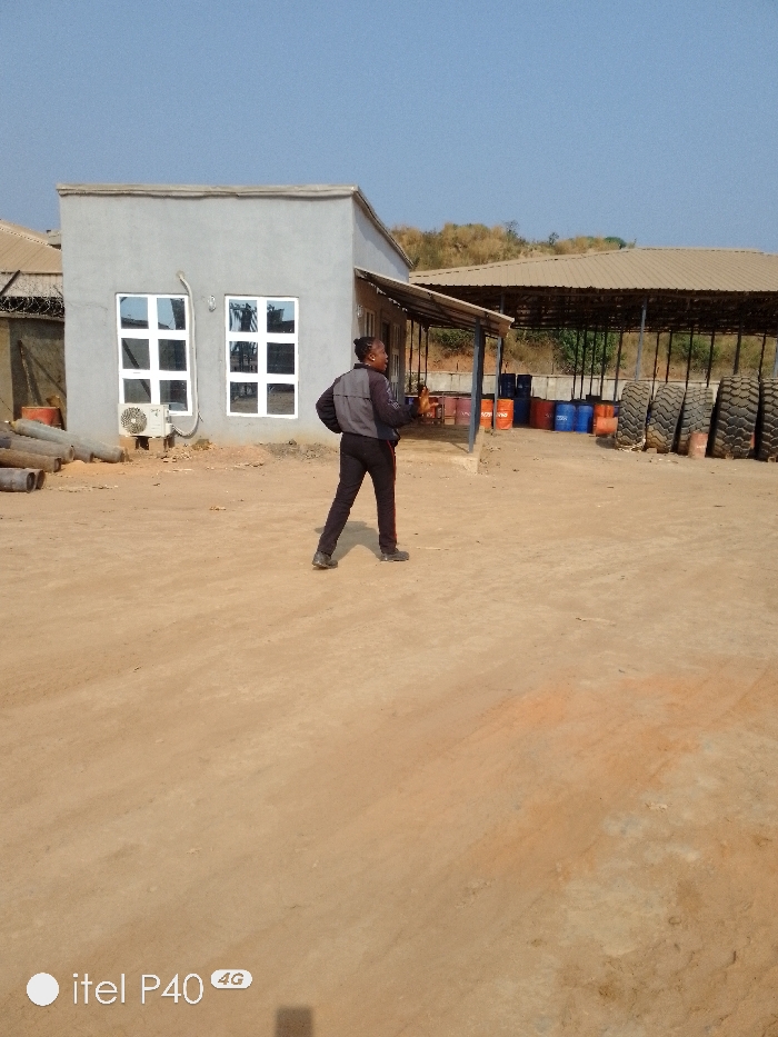 The image captures an outdoor industrial or storage area in the city of Hoche, Nigeria, under a clear blue sky