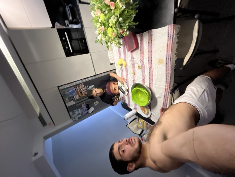 This image depicts an indoor scene within a modern residential kitchen and dining area. The specific location within Rishon LeZion, Israel, cannot be determined from the visual information provided. **People:** 1. A male individual is positioned in the foreground, taking a selfie. He is bare-chested, has dark hair and a beard, and is wearing white shorts. His right arm, extended towards the camera, reveals a faint tattoo or inscription on his forearm. He looks directly at the camera with a wide-eyed, slightly surprised expression. 2. A female individual is seated at a dining table in the background. She has dark hair styled back and is wearing a black t-shirt featuring a graphic print of a man's face with a purple beanie. She also looks directly at the camera with a serious or mildly stern expression, her hands resting near a plate. **Objects and Environment:** The scene is centered around a dark dining table, partially covered by a white tablecloth adorned with horizontal red stripes and fringed edges. The tablecloth exhibits multiple stains and food remnants. On the table, a large floral arrangement in a dark vase, containing pink and white roses and green foliage, is visible. Other items on the table include several plates with discarded food (possibly sushi), a bright green colander nested within a silver bowl, a small red plastic container, a yellow object, and a white bottle/flask. In the background, a refrigerator is heavily decorated with numerous photos and magnets. Above and adjacent to the refrigerator are light-colored, built-in kitchen cabinets and a built-in oven and microwave unit. An air conditioning vent is visible on the ceiling. The overall lighting appears to be artificial, typical of an interior setting. Parts of dark dining chairs are visible around the table.