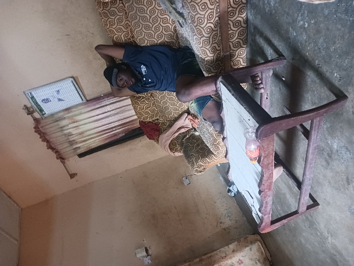 The scene depicts the interior of a room, likely a living area, located in Unknown, Unknown. An adult male is seated on a multi-toned patterned sofa, positioned towards the right side of the frame. He is wearing a dark blue polo shirt, dark shorts, and a dark beanie, with his arms raised and hands clasped behind his head. He is barefoot. A red fabric item is draped over the left armrest of the sofa. In the foreground, a low, rectangular dark wooden table with a light-colored patterned surface holds a clear plastic bottle containing an orange liquid. The walls are light brown, exhibiting signs of wear and discoloration. The floor is made of concrete. A window, partially covered by patterned curtains, is visible on the back wall, above which a framed document or poster is mounted. An electrical outlet or switch is present on the left wall. A pair of dark-colored flip-flops rests on the floor to the left of the sofa.