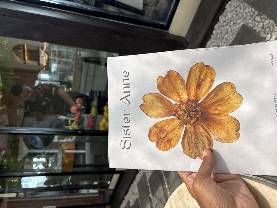A menu titled "Sister Anne" features a dried orange flower on a white background