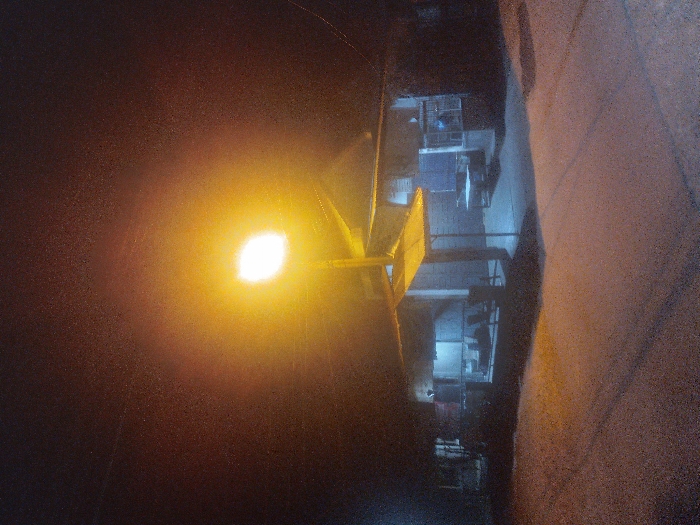 A street lamp illuminates a wet, dark street at night. The light is bright and yellow, with a pole extending downwards. A building runs parallel to the street. The ground appears to be slick with moisture, reflecting the ambient light. The overall atmosphere is gloomy, with low visibility due to the dark environment.
