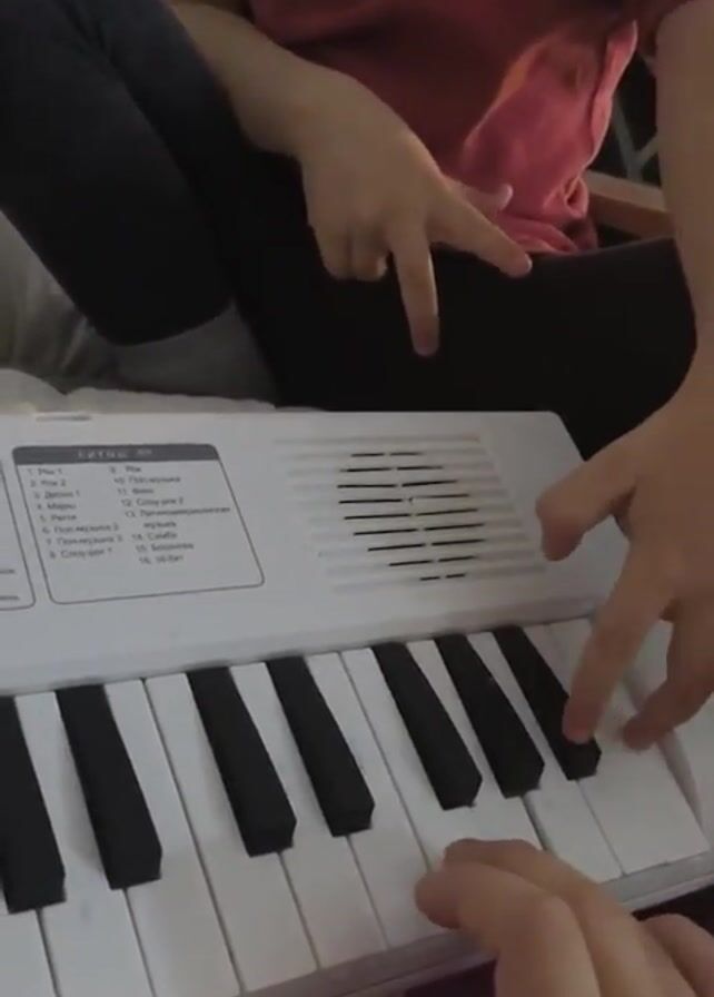 A child wearing a pink shirt and dark pants sits in the background, while an adult assists the child in playing a small, white electronic keyboard