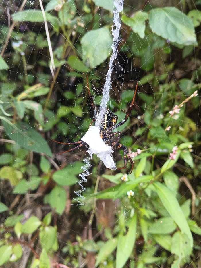A large spider with orange-tipped legs sits on its web, holding a small, white, wrapped object. The web is suspended among lush green foliage. A thick, vertical band of extra webbing runs through the center, and below the spider, a zig-zag pattern of web extends downwards. The surrounding vegetation includes leaves of various shapes and small pink flower spikes.