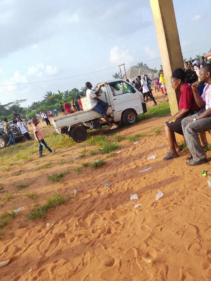 A sunny outdoor scene features a small white pickup truck with a man sitting on its bed. A young boy walks in front of it. To the right, two adults are seated near a large pole. A crowd of people is visible in the background, along with trees and buildings. The ground is sandy, marked with footprints and scattered with pieces of white trash.