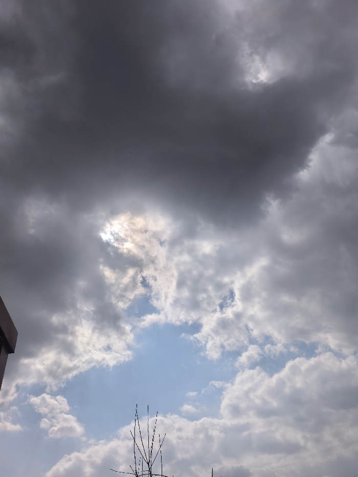 The image displays an overcast sky with a dynamic cloud formation. Dark grey, dense clouds dominate the upper and left portions of the frame, with several small, dark specks faintly visible within the upper left cloud mass. A bright, luminescent area, likely the sun partially obscured by clouds, is present in the upper-middle left, emitting a diffused glow through lighter grey and white clouds. Below this, a distinct, irregularly shaped patch of clear blue sky is visible in the lower-middle portion of the image, bordered by white cumulus clouds. In the bottom-left corner, a dark, angular edge of a building or structure is partially visible, extending from the left frame margin. Silhouetted against the blue sky in the bottom-middle are several sparse, dark, leafless branches or thin structural elements, appearing twig-like. The scene depicts a transitional sky, suggesting partial sun amidst significant cloud cover. No specific landmarks or identifying features are present within the image to determine a precise location within the city of Varna, Bulgaria.