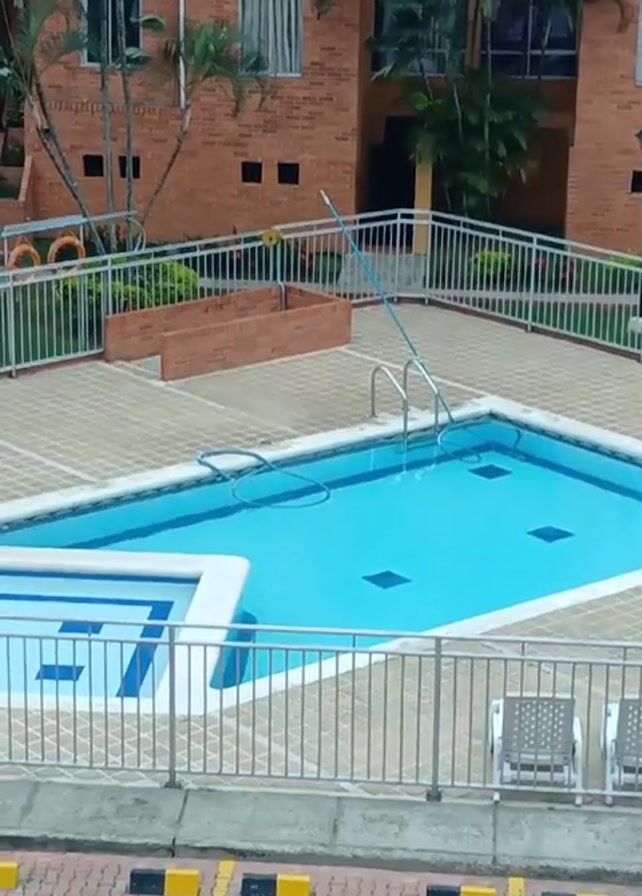n outdoor swimming pool in a residential complex. The pool is rectangular with blue water and blue tile accents. It's surrounded by a paved area and a gray metal fence. Two white plastic chairs sit near the pool. Palm trees and a brick building are in the background. A pool cleaning tool leans against the pool ladder. The camera is positioned above, looking down at the pool area, near a parking zone marked with yellow and black paint.