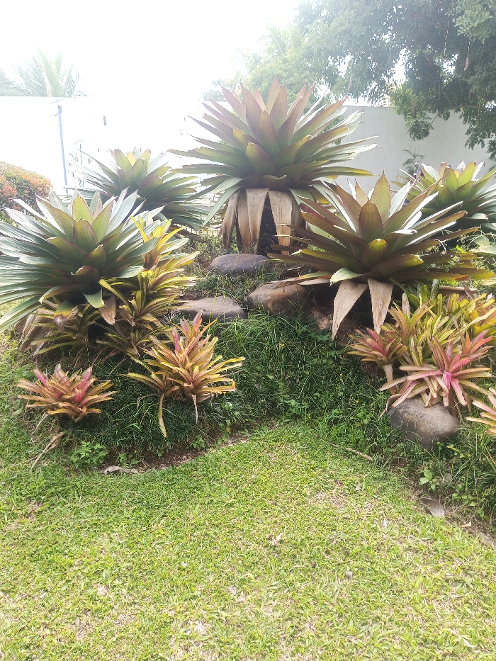 A cluster of bromeliads of varying sizes and colors dominates the landscape