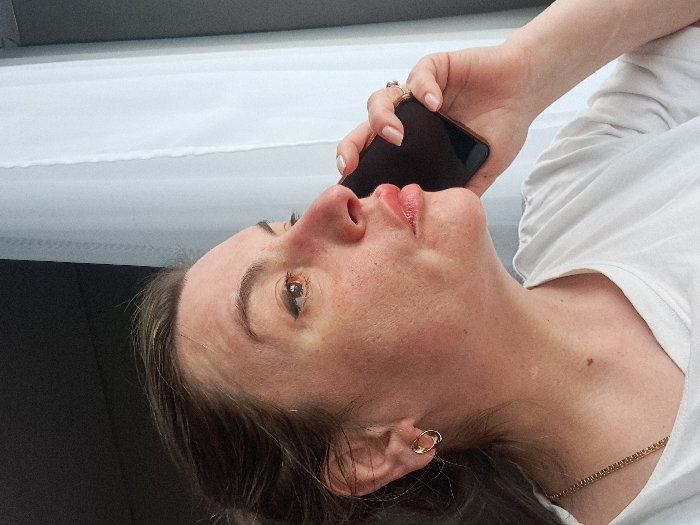 An indoor scene in Saransk, Russia, displays a female individual from the chest up, positioned in right profile and gazing slightly upward. Her right hand holds a dark-colored smartphone to her right ear and mouth. The individual has brown hair, light skin with visible redness around the nasal and malar regions, and wears a white short-sleeved garment. A gold-toned hoop earring is present on her visible left ear. A thin, gold-toned chain necklace is discernible around her neck. Her lips are slightly pursed. A ring is visible on her right ring finger, and her fingernails exhibit a light-colored polish. The background consists of a sheer white curtain covering a window on the right side of the frame, with a dark, indistinct area located behind her head to the left. No identifiable outdoor elements are discernible through the window.