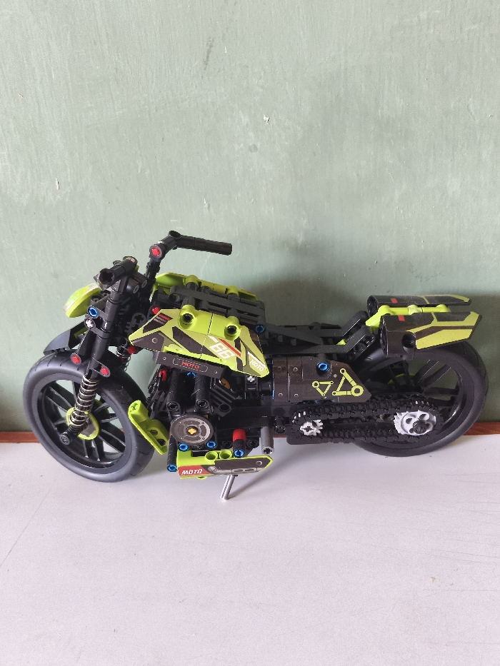 - "The scene, situated in Chimbote, Peru, depicts a model motorcycle, primarily lime green and black, constructed from building blocks" by FM-uSc8y1, licensed under CC BY 4.0