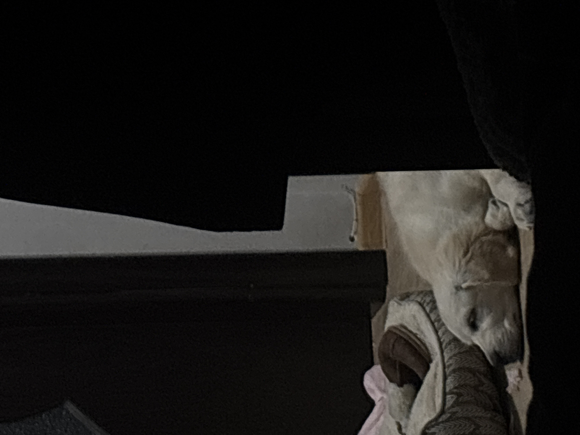 A close-up shot shows a dog lying on a pile of blankets. The dog is light-colored, possibly white or cream, and appears to be sleeping or resting. The blankets are a mix of textures and colors. A piece of furniture, possibly a shelf or part of a bed, is visible in the background, along with some dark areas that could be part of the room or shadows. The location is not determinable.
