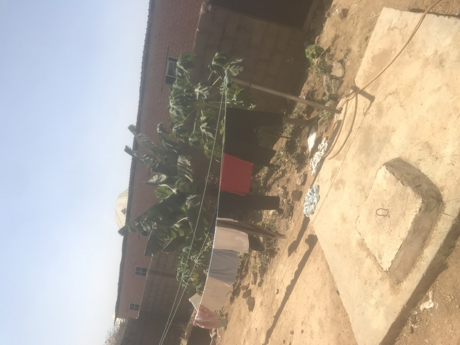 The scene depicts an outdoor residential compound in Agingi Zion, Nigeria, under clear, sunny daytime conditions