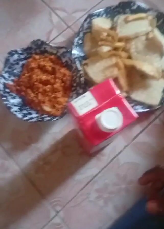 Here's a forensic description of the scene in the video: A camera points down at a low angle towards a tiled floor with a red and beige flower-like pattern. Three objects are arranged on the tiles. On the left is a small, wavy-edged bowl with a black and white pattern filled with a reddish-orange, minced-looking food item. To the right of that, on a matching plate, is a pile of pale beige, thick-cut fries or potato wedges. Between the plates is a small, red, rectangular carton, likely juice or milk, with a white cap. The tiles and objects are partially illuminated by a light source above the scene. At the very bottom of the frame, a sliver of dark blue fabric or clothing is visible. The plates and carton form a simple breakfast arrangement.
