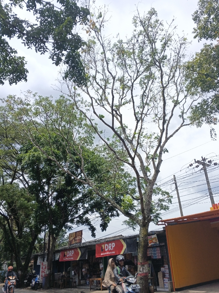 A roadside scene depicts a partially bare tree in the foreground, alongside lush green trees. In the background, a store displays "DRP" signage. A motorcycle carrying two individuals passes by the store. Overhead power lines are visible against a cloudy sky. Part of a yellow building is shown on the right. Another person on a motorbike is visible in the left background.