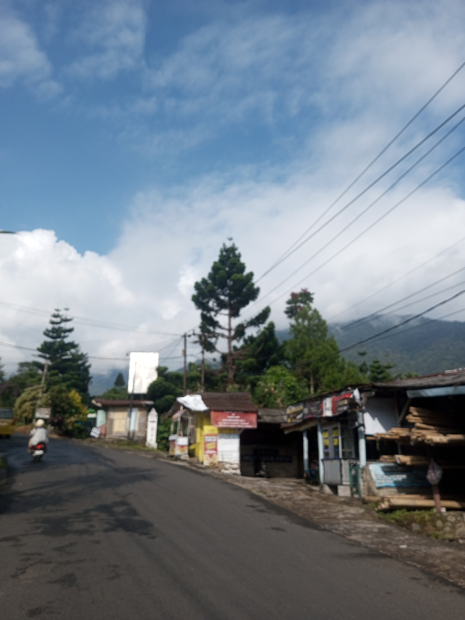 A blurry daytime photograph shows a paved road curving gently uphill, lined on the right with a row of small, mostly single-story shops or stalls with corrugated metal roofs. The shops appear to sell various goods; lumber is visible stacked outside one. Power lines run above the street, crossing the frame diagonally from the top right. A single motorbike with a rider is visible on the left side of the road, moving away from the viewer. Trees and other vegetation are present throughout the scene, some obscuring buildings further up the slope. In the background, a mountain is visible, partially shrouded in mist. The sky is blue with scattered white clouds.