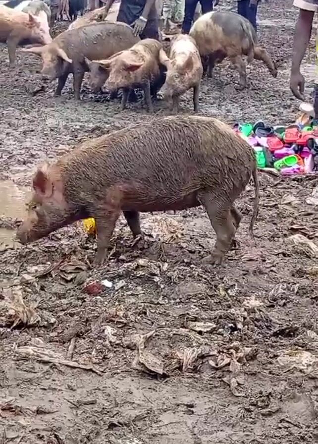 several pigs wading in a muddy area with trash scattered throughout. Several adults are present in the scene. In the beginning, a man in a yellow t-shirt and American flag shorts reaches for one of the pigs. A man in a blue shirt walks through the mud, briefly grabbing one of the pigs by its tail. A white truck is also seen driving through the mud.