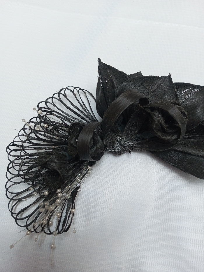 - "A black decorative accessory, likely a hair ornament or fascinator, is depicted in a close-up, high-angle view against a plain, off-white, finely textured background" by FM-pCjCH3, licensed under CC BY 4.0