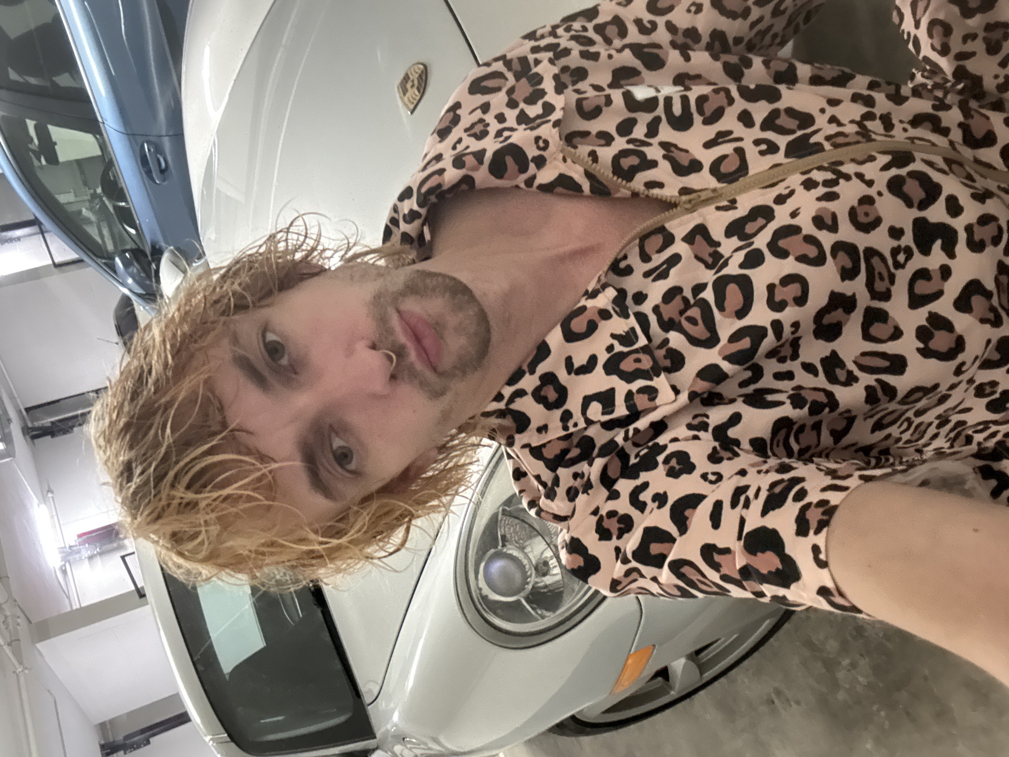 The image displays a male subject taking a selfie within an indoor parking garage, hypothetically located in Tel-Aviv, Israel. The subject is centered, presenting light-colored, disheveled hair, stubble, and a gold-colored hoop nose ring in his left nostril. He is dressed in a light pink and brown leopard-print jumpsuit with a visible gold-toned front zipper. Behind the subject, to his left, is the front portion of a silver Porsche sports car, identified by its circular headlight and the Porsche crest visible on the hood. A blue sedan or SUV is partially visible further in the background, to the subject's right. The environment is characterized by a concrete floor, white-painted concrete walls, and a ceiling with exposed utility conduits and fluorescent lighting, consistent with a subterranean parking facility.