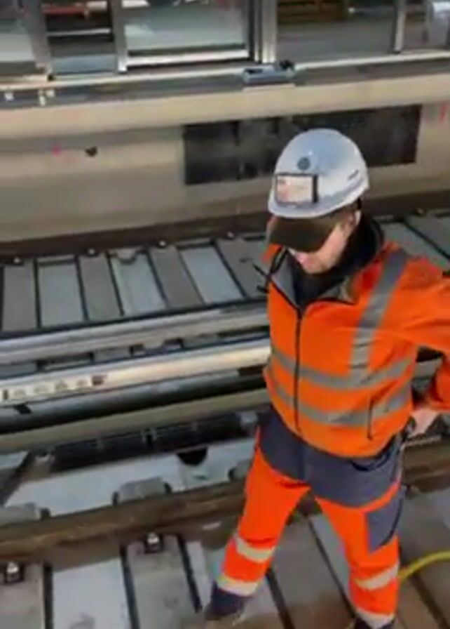 A construction worker in an orange high-visibility jacket, orange pants, a white hardhat, and work boots, is walking along train tracks with a yellow hose in his hand. He looks up, sees the camera, and extends his hand for a handshake. The video is shot from a low angle, and the camera shakes as the person filming shakes hands with the construction worker. The background shows a train car and some structural elements of the construction site.