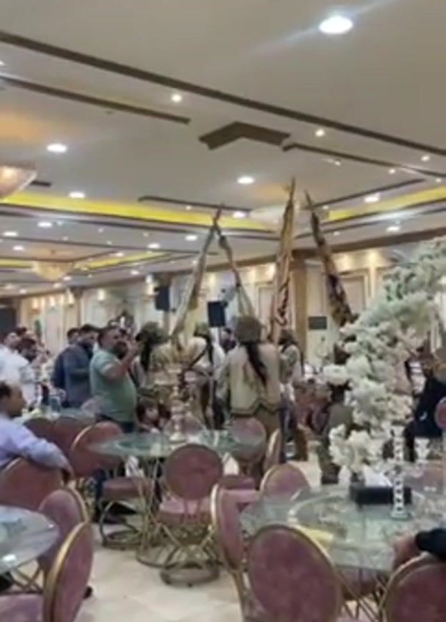 Inside a brightly lit banquet hall, a group of men in traditional Middle Eastern attire are parading through the room, carrying tall, decorative flags