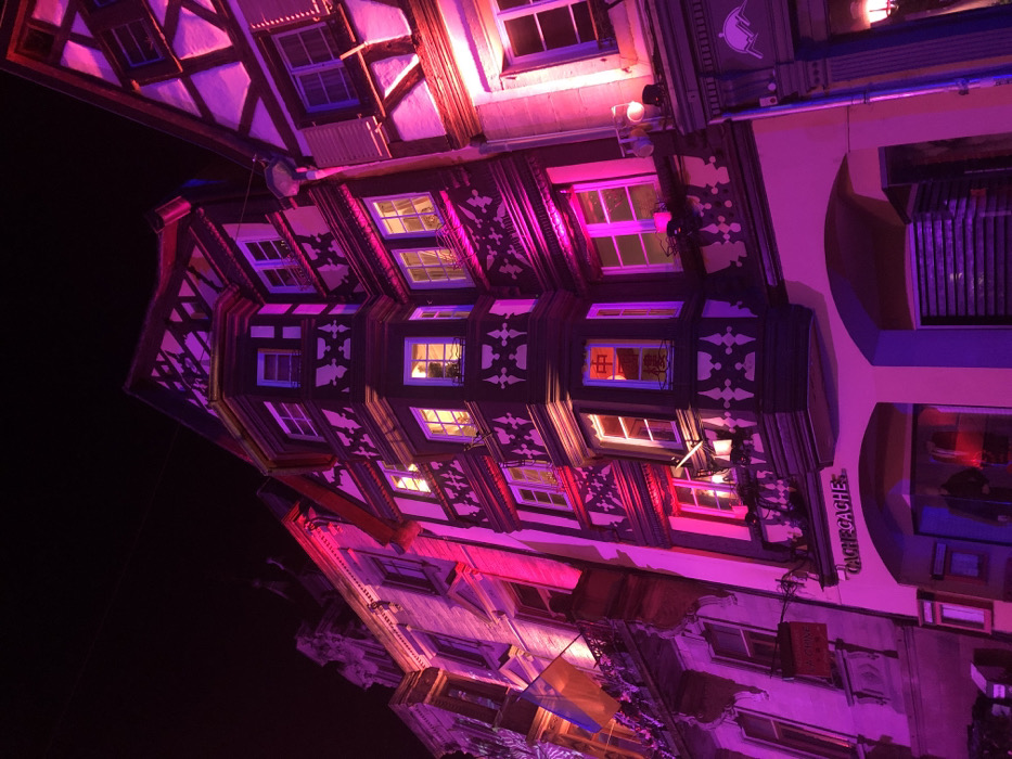 A nighttime shot of a building's exterior, lit with vibrant pink and purple hues. The architecture features a decorative half-timbered design with numerous windows. Some windows are illuminated from within, displaying signs or objects. The angle emphasizes the building's height and ornate details. The sky is dark.