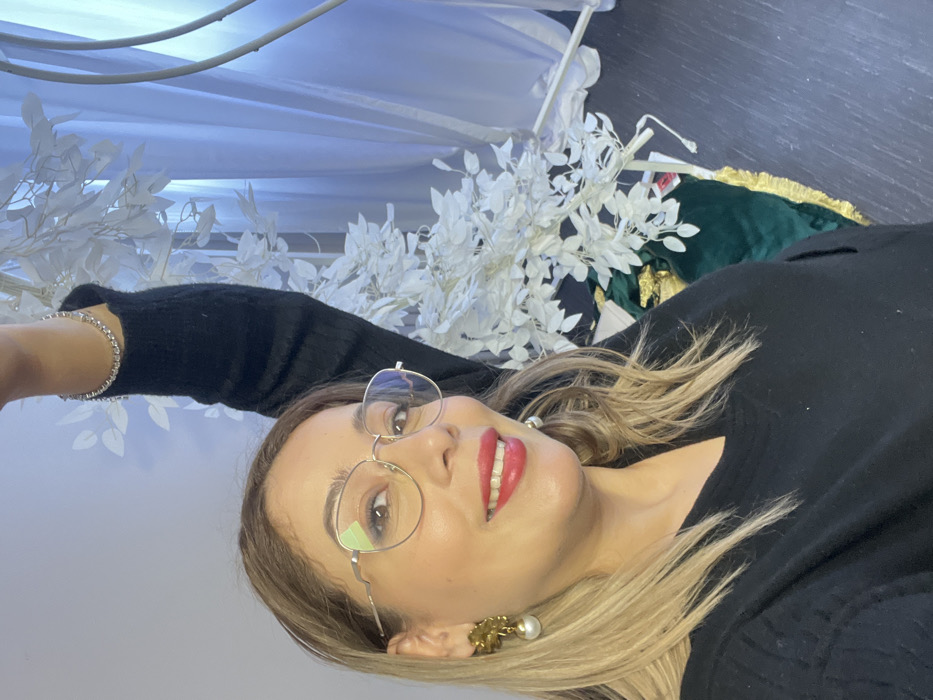 This image, taken in Mondeville, France, depicts an indoor scene focused on a light-skinned female individual. The woman, positioned in the foreground, has shoulder-length blonde hair, gold-rimmed hexagonal eyeglasses, and red lipstick, displaying a slight smile directly at the camera. She wears a black v-neck sweater and a gold-toned floral earring with a white pearl drop on her left ear; a similar, partially visible earring is on her right ear. Her right arm is raised above her head, showcasing a silver-toned bracelet on her wrist. To the right of the woman, a decorative arrangement is present, featuring numerous white artificial leaves on branches, possibly a stylized tree, set in a dark green fabric base with a gold fringe. Behind this arrangement, a white translucent curtain is visible, alongside part of a white metal frame. The floor surface appears dark.