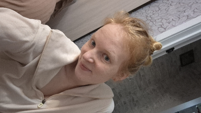 The scene takes place indoors in Nizhnyaya Gar', Russia. An adult female is depicted from the chest up, looking directly at the camera with a slight smile and her head tilted right. She has reddish-blonde hair styled into multiple small buns on top of her head, fair skin, and blue eyes. She is dressed in a light beige, ribbed garment, possibly a hooded top, with a light-colored zipper pull visible on the right chest area. The background consists of two distinct wall sections: to the left, a light-colored wallpaper with a floral or swirling pattern; to the right, a dark gray, textured wall, possibly brick or concrete, with a dark rectangular object mounted high. A white vertical trim separates the two wall types. A blurred, light-toned fabric mass is partially visible in the lower-left foreground.